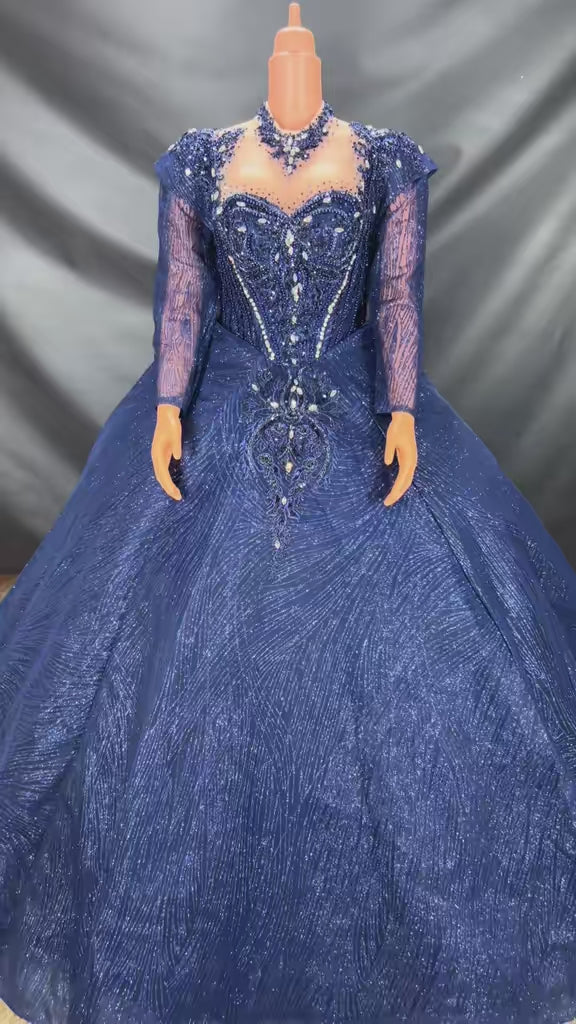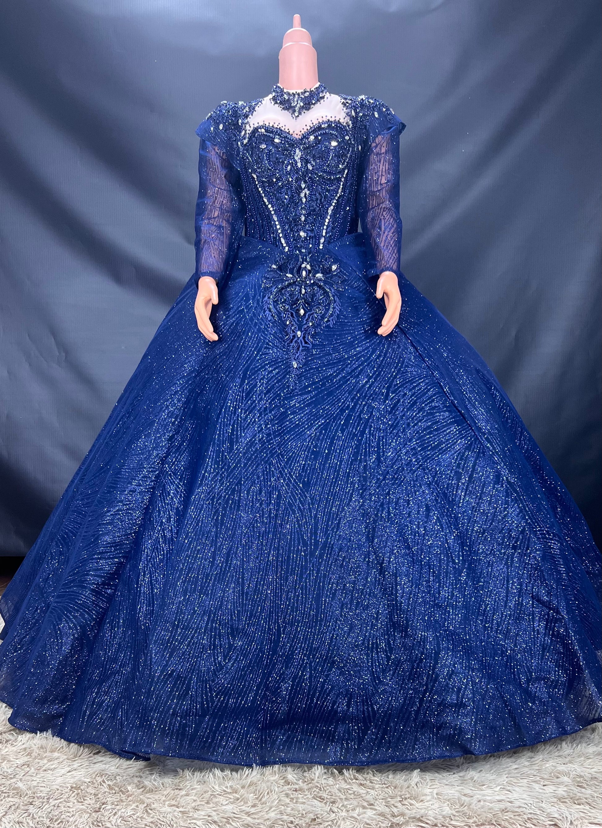 | The product is a stunning blue wedding dress in size XL, featuring a ball gown style with a corset and zipper back closure. This elegant dress has long sleeves and a beautiful ball gown/duchess silhouette, making it perfect for a formal occasion like a wedding. The dress is designed with a regular size type in mind, ensuring a comfortable and flattering fit for the bride. |